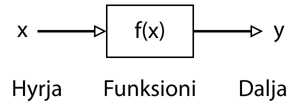 \[\begin{array}{rcl} 45° \rightarrow & \boxed{f(x)} & \rightarrow \frac{\sqrt{2}}{2} \\ 6 \rightarrow & \boxed{g(x)} & \rightarrow 36 \\ \texttt{'c'} \rightarrow & \boxed{h(x)} & \rightarrow 3 \end{array}\]Funksioni $y = f(x)$ merr një parametër $x$, e transformon sipas rregullës $f(x)$, dhe kthen një rezultat $y$.