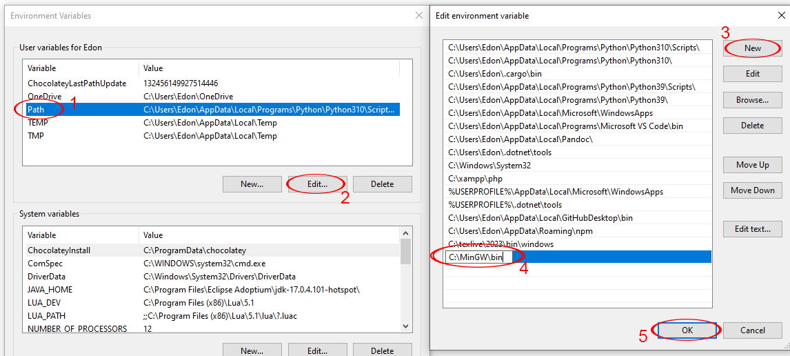 Variablës PATH duhet t’i shtohet pjesa C:\MinGW\bin