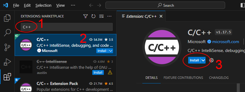 Në shiritin për kërkim e shkruajmë C++, dhe instalojmë C/C++ si në pamjen në vijim: