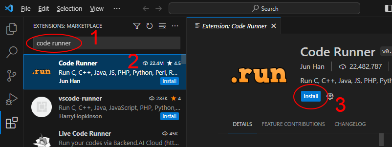 Në shiritin për kërkim e shkruajmë code runner, dhe instalojmë Code Runner si në pamjen në vijim: