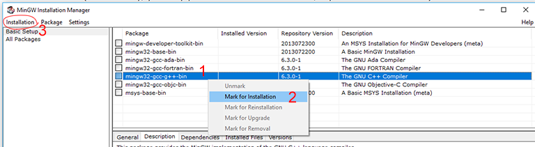mingw32-gcc-g++-bin.Mark for Installation.Installation > Apply Changes > Apply, dhe presim deri të mbarojë.